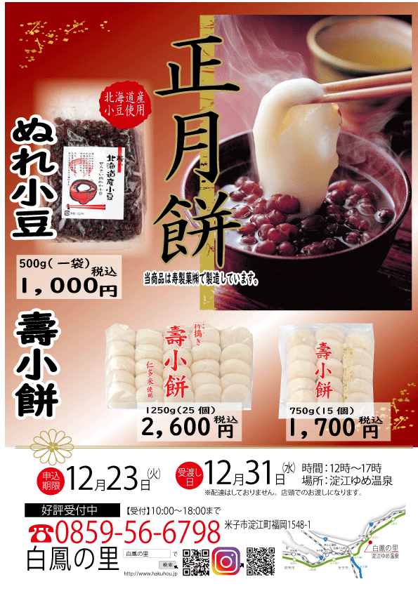 ☎0859-56-6798 (白鳳の里10:00~18:00) ☎0859-56-6801 (淀江ゆめ温泉10:00~21:00) |