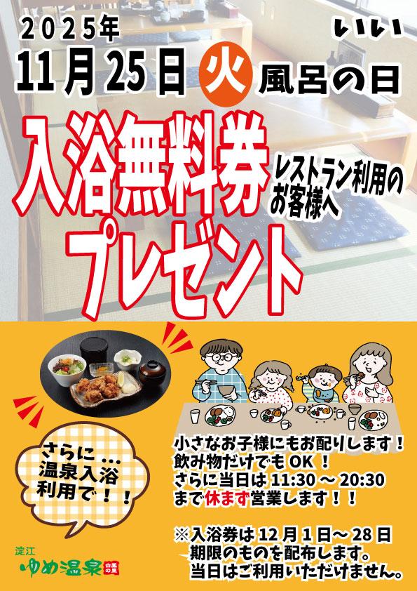 11月25日(火)にレストランゆめ亭で御食事された方全員に、もれなく温泉入浴無料券を進呈します。食と温泉を満喫してください!!